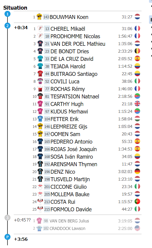 Y es que eran menos de cuatro minutos el tiempo de ventaja de los pedalistas que se mantenían en la delantera de la fuga, en un grupo que aún era numeroso. Mientras que el neerlandés, Koen Bouwman aceleraba y trataba de tomar distancia en el ascenso al Pila (Les Fleurs):