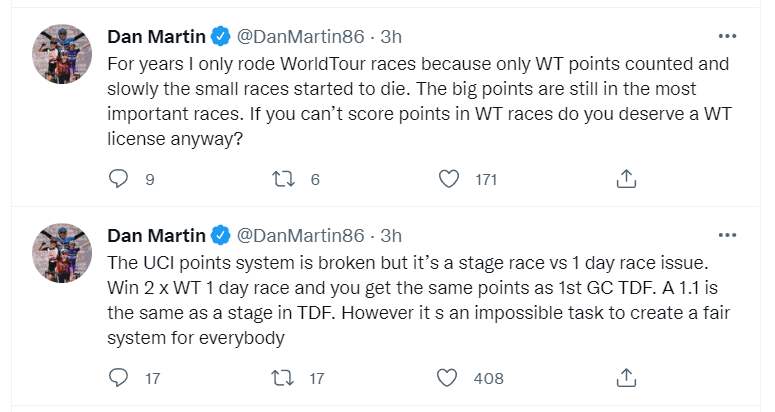 El debate inicia con este mensaje del retirado Dan Martin, sobre el sistema de puntos de carreras WorldTour versus el sistema de puntos de carreras de un día o de menor categoría. Resulta que no hay una distribución proporcional entre una división y la otra en cuanto a puntos por competencia.