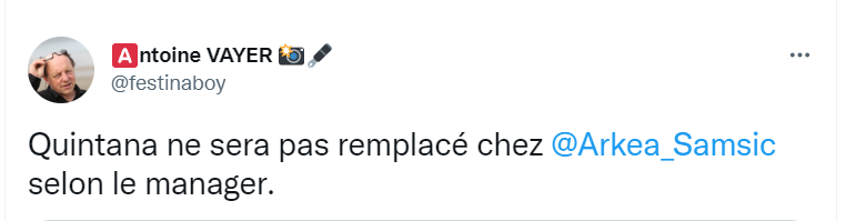 «Quintana no sería reemplazado en el Arkea Samsic, dice su mánager», adelanta Antoine Vayer, exdirector del Festina y recurrente panelista en programas deportivos en su país: