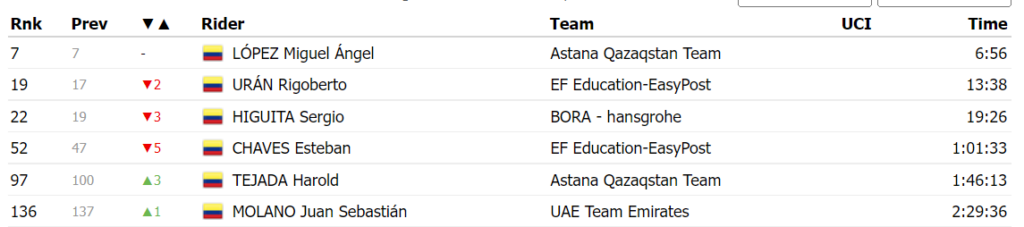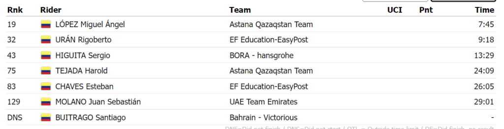 La jornada fue ganada por Richard Carapaz, quien estuvo en la fuga. El ecuatoriano logró darle a su país una nueva victoria en las grandes. Por el lado de los colombianos, el mejor fue López. Así les fue en la etapa: