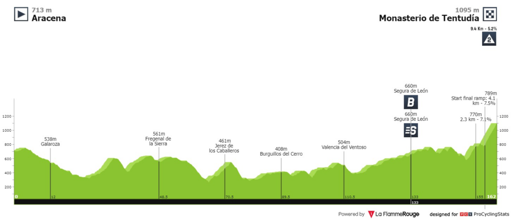 Entre Aracena y Monasterio de Tentudía, se recorrerán 162,3 kilómetros que desembocarán en un puerto final de montaña, será de 9,4 kilómetros al 5,2%: