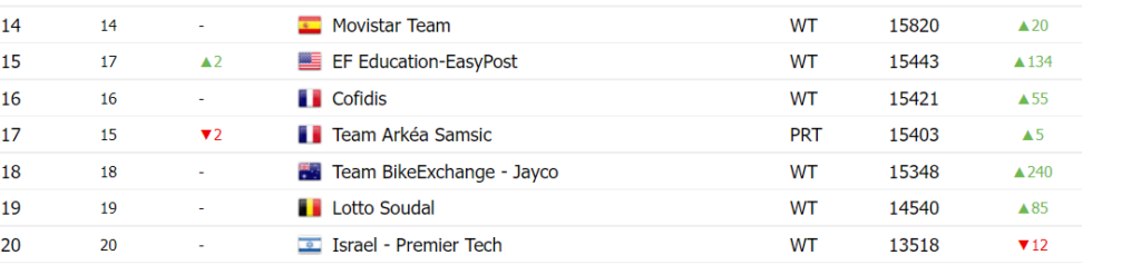 Y la realidad es que ahora el Arkea ocupa la casilla 17 de ese escalafón, solamente por encima del BikeExchange de Simon Yates, pero a solo 55 puntos de diferencia… luego de eso, está el Lotto Soudal que es el primer descendido: