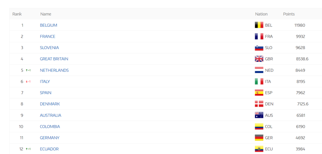 Colombia se ubica en la casilla 10 con un total de 6190 puntos frente a los 3984 de Ecuador. Mientras que la tabla es liderada por el imponente ciclismo de Bélgica, Francia y Eslovenia. Tadej Pogacar y Primoz Roglic, los principales exponentes eslovenos siguen haciéndose notar en cada competencia, especialmente en los últimos dos años.