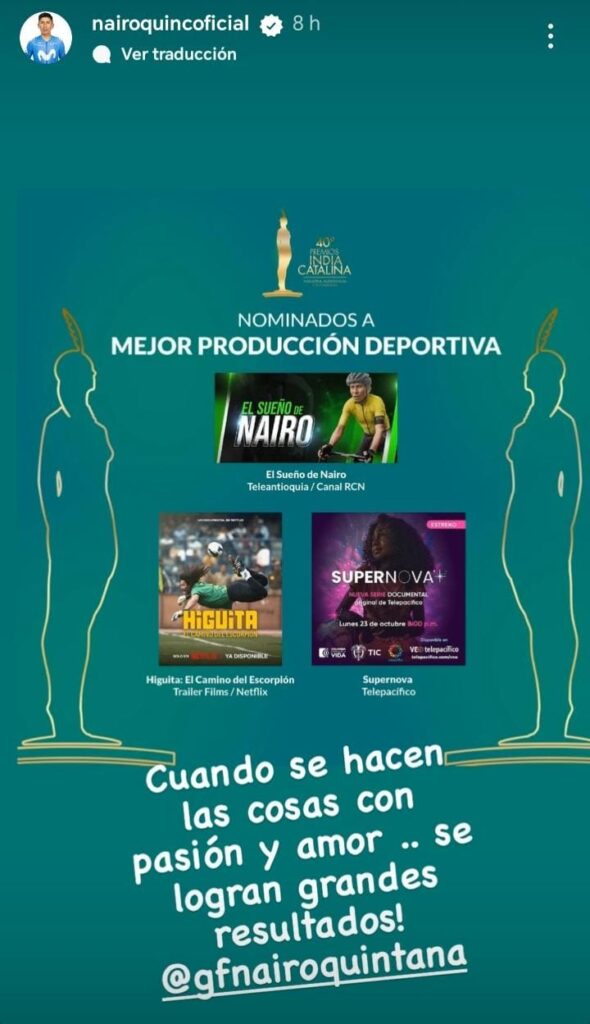 La producción está nominada ahora al reconocido Premios India Catalina 2024, los cuales se entregarán este 18 de abril. «El Sueño de Nairo» estará compitiendo en la categoría Mejor Producción Deportiva con «Supernova», un producto de Telepacífico, y con «Higuita: El Camino del Escorpión» que se ve por Netflix.