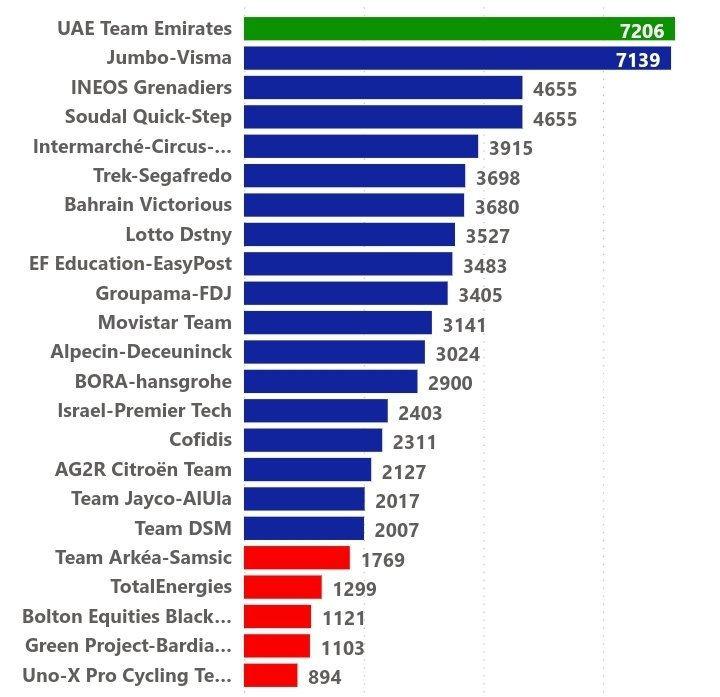 Con 1769 puntos, ya hay una diferencia de casi 300 puntos con el DSM y no pareciese que hubiese un ciclista que lleve esa carga como lo hizo Nairo en su momentos… tampoco los velocistas encuentran suerte, ni Hofstetter, ni McClay, ni Bouhanni logran conseguir triunfos.