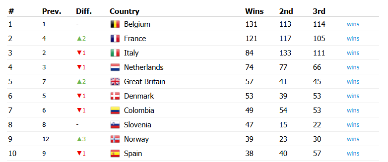 Y bueno, también una estadística que cuenta la cantidad de triunfos en el año. Colombia acumula 49 sobre los 47 de la Eslovenia de Pogacar y Roglic. Pero claro, los triunfos de los eslovenos son muchísimo más de peso que los colombianos, que se limitan en gran parte a carreras de menor valía, de menor categoría, mientras que Primoz y Tadej forjaron victorias de talla internacional: Tour, Vuelta, Mundial.