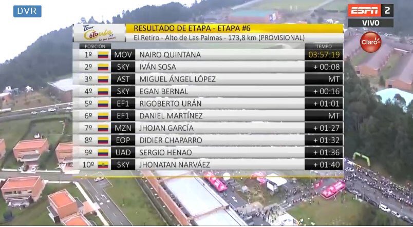 Pero tras el Sky, estaba el Movistar Team con Anacona, Nairo y Carapaz; a igual distancia el Astana con Superman López a la cabeza junto a Contreras y antes, el Education First con Rigoberto y Daniel Felipe Martínez… todos candidatos. El momento había llegado y había que atacar.