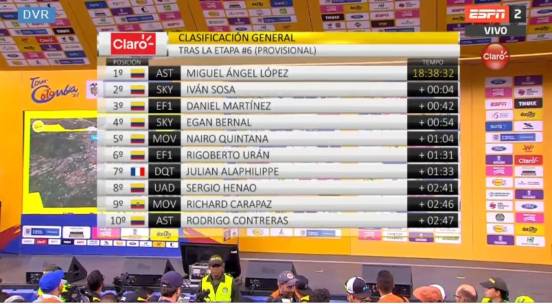 Superman no pudo, mantuvo el ritmo, pero Sosa, alentado por Egan Bernal, le llegó al de Pesca y ambos, en un momento dado, se quedaron mirándose el uno al otro, pues Sosa tan solo debía sacarle 3 segundos a López, por lo que este espero.