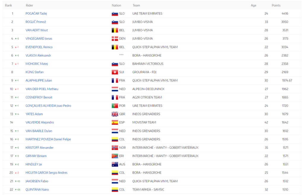 Quintana subió 26 puestos, siendo del top 25 del mundo, quien más casillas ascendió ahora ocupa la posición 22, poniéndose como uno de los mejores de Colombia, muy cerca a Sergio Higuita y Daniel Felipe Martínez, según reporta la UCI en su actualización post Tour: