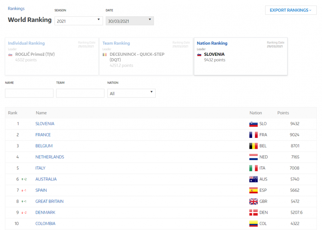 Colombia está con 4322 puntos, en la posición 10. El que lidera dicha tabla es Eslovenia por lo hecho por Tadej Pogacar y Primoz Roglic por 9432 puntos.