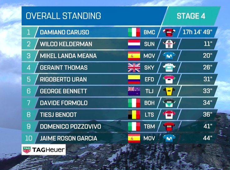 No obstante, Urán ascendió al 5to puesto de la general, superando a un Froome que salió del Top 10 y quedando a 31 segundos del nuevo líder Damiano Caruso. Infortunadamente López también salió del top 10 de la general.