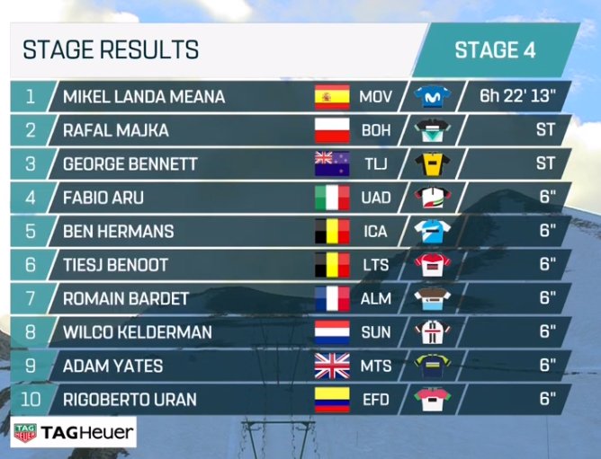 En su lugar apareció Mikel Landa quien se unió a Majka y Aru en la escapada. Más atrás, Froome y López se fueron quedando por detrás del pelotón y Urán se mantuvo en el pelotón, que llegaría seis segundos después del español quien al final atacaría y se llevaría la carrera de hoy.