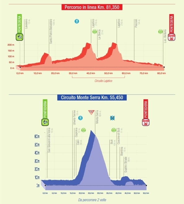 La competencia está compuesta por un doble circuito con el que se completó el recorrido en la misma ciudad de Pontedera sobre 191 km en los que la alta montaña hará la selección de los corredores que irán por el título que en la temporada pasada Fernando Gaviria consiguió.