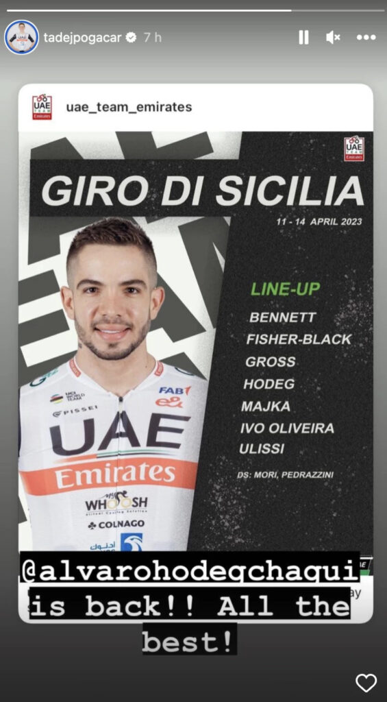 En la historias del doble vencedor del Tour de Francia, apareció un mensaje dedicado a Álvaro Hodeg, quien estará de regreso en el Giro de Sicilia 2023, en Italia. «Álvaro Hodeg está de regreso, te deseo lo mejor», fue el mensaje que dedicó el actual campeón de la París Niza a la publicación.