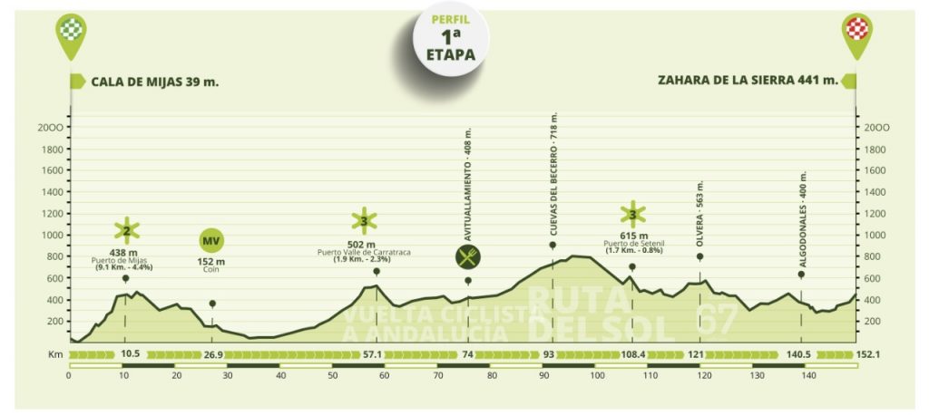 El arranque de la competencia española se dará sobre un trazado de 152 km entre Cala de Mijas y con cierre en Zahara de la Sierra. El recorrido inicia con una subida de 2da categoría en la que se espera que marche el pelotón a muy buen tiempo.