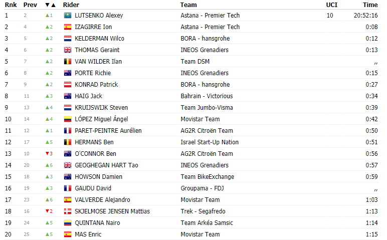 El de Cómbita salió en el puesto 24, pero al finalizar avanzó 5 puestos y se encuentra en el puesto número 19, al llegar 12 en la jornada de hoy. Nairo se encuentra a 1 minuto y 14 segundos de Alexey Lutsenko.