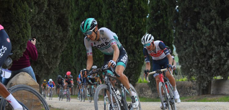 Los ciclistas clásicos estarían familiarizados con las polvorientas carreteras muy similares a las de la Strade Bianche. Durante el recorrido de la etapa, el BORA-Hansgrohe se aseguró de que el jefe para la clasificación general del equipo, Emanuel Buchmann, se mantuviese a salvo por delante de los sectores de grava.
