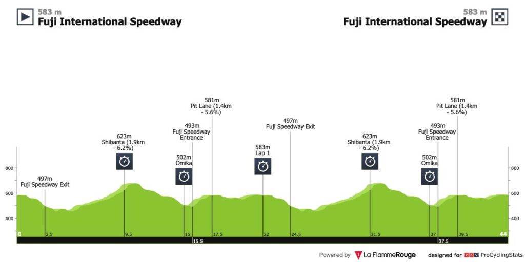 44,2 km será el recorrido para la prueba de contrarreloj en el circuito que se destinó en Fuji International Speedway. Allí se habrá 5 tomas de tiempo.
