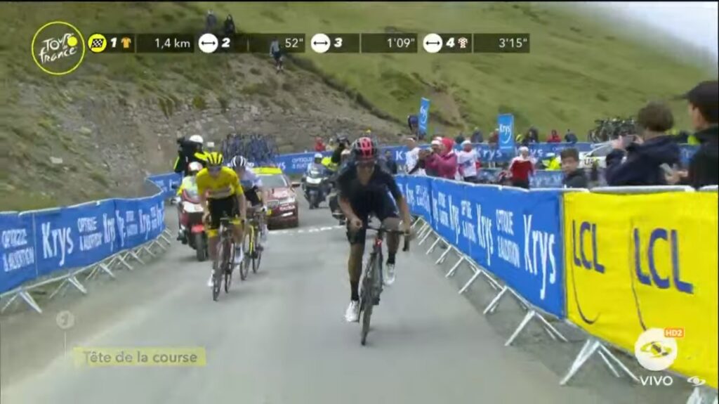 Vingegaard ha resultado tomando el tiempo necesario para meterse en la posición 2° quedando a 5’39», Carapaz ha soportado el ritmo de los dos pedalistas más fuertes y se quedado con la 3° a 5’43». Durante los últimos kilómetros del ascenso al Col de Portet el ecuatoriano no ha querido pasar a tirar del grupo cuando Tadej y Jonas se lo han pedido.