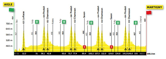 Entre Angle y Martgny los pedalistas darán 4 vueltas al circuito que pasa por dos cimas específicamente: Prodult y Chamoson, ambas de 1 categoría.