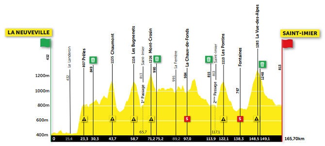 La Neuveville abre la etapa 2 con terreno que tendrá un pequeño repecho en su inicio, para luego asumir los 6 ascensos que llevarán hasta Saint Imier con un final totalmente llano. Será quizás una de las etapas más complicadas para los ciclistas.