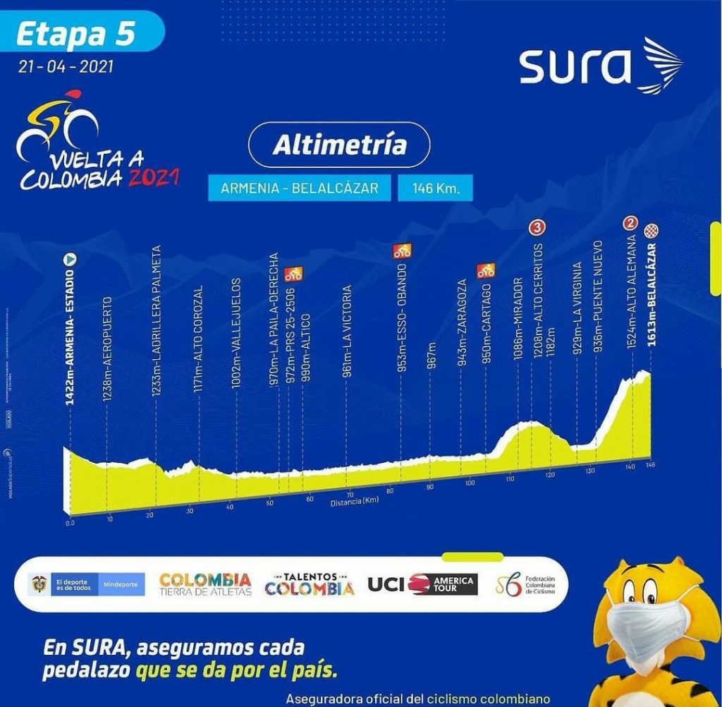 Esta vez el recorrido parte desde la ciudad de Armenia e irá hasta Belalcázar, municipio caldense sobre 146 km con 3 sprints intermedios y 3 puertos de montaña.