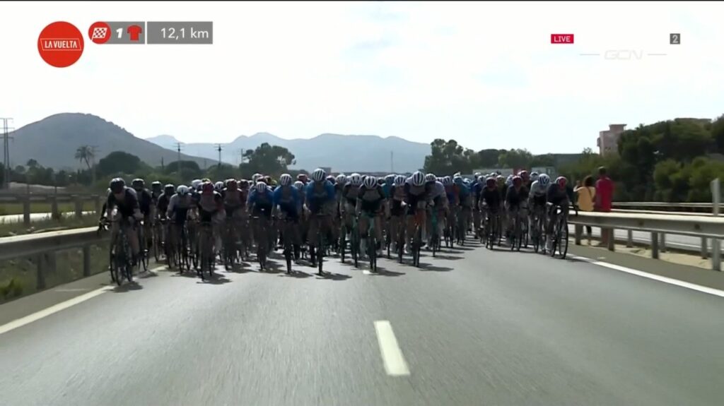 Mientras que atrás escuadras como el Deceuninck Quick Step tiraban del pelotón intentando conservar una diferencia controlable para el grupo principal y pensando en llevar a los pedalistas más rápidos hasta la meta.