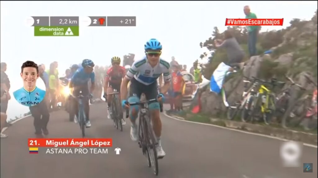 El colombiano Miguel López subió Lagos de Covadonga en el 2018 cuando hacía parte de la nómina del Astana Premier Tech. Allí lograría permanecer con los corredores más fuertes antes de lanzar un ataque que, aunque no lo dio el triunfo del día, lo puso segundo en la etapa y entre los primeros 4 puestos de la general.