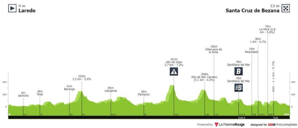 Serán 180 km entre Laredo y Santa Cruz de Bezana y allí se ubica casi sobre la mitad del recorrido un ascenso de 3ra categoría al Alto de Hijas, sin embargo, a lo largo del trayecto habrá repechos complicados de pasar lo que ocasionaría que algunos de los sprinters pueda quedarse acusando cansancio.