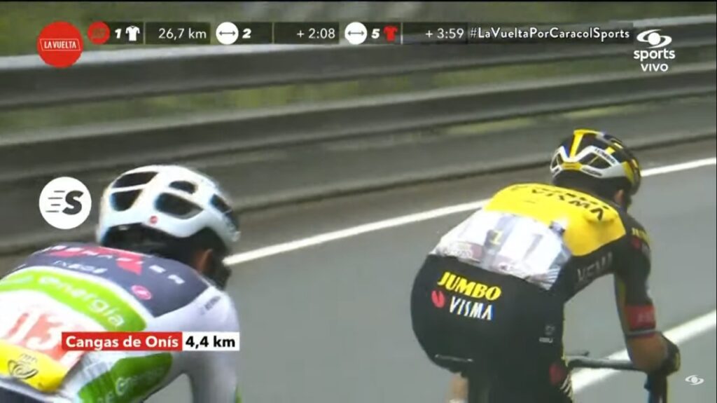 Atrás intentaba reaccionar Miguel Ángel López, pero Enric Mas apenas veía cómo pasaba todo por delante, quizás un poco golpeado por la caída del día anterior. Sin embargo, López no logró conectar con Egan y Roglic, por lo cual prefirió volver al grupo persecutor.