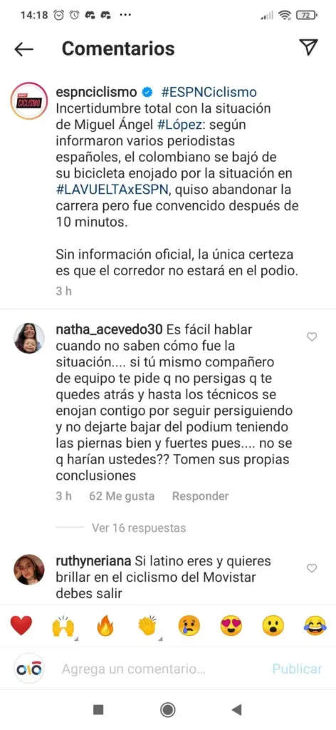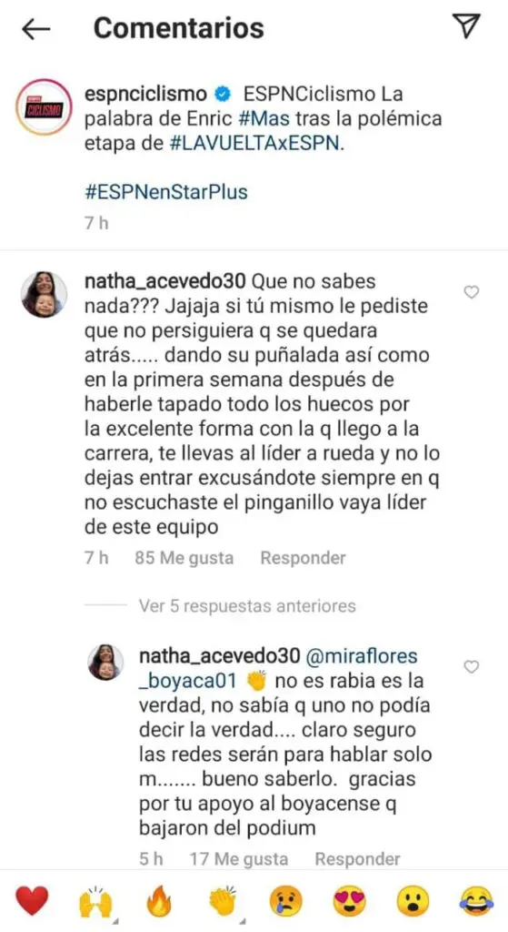 Pero en redes sociales y en entrevistas hay acusaciones bastante claras, contra Enric Mas y contra Eusebio Unzué… de hecho, se habla de todo el equipo de entrenadores. Nathalia Acevedo, pareja del colombiano, lanzó estas palabras cuando respondía a comentarios por redes sociales, con el usuario Natha_Acevedo 30: