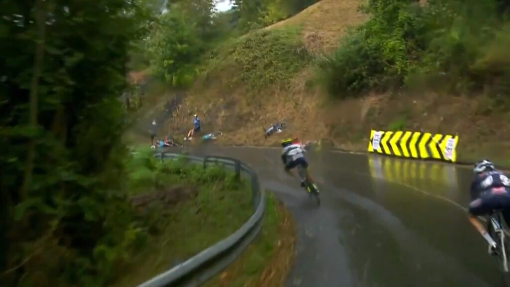 La mala noticia para Colombia, es que Sergio Luis Henao y Aleksandr Vlasov se fueron al suelo, luego de una peligrosacurva en descenso, en medio de la lluvia: