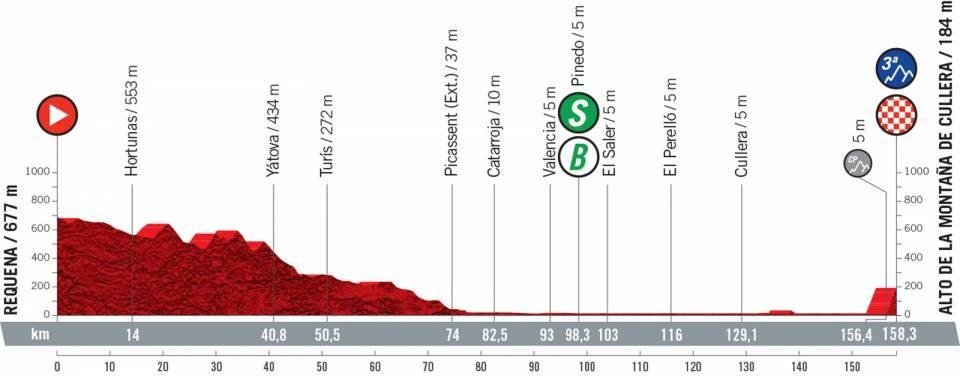 Algunos repechos le dan la bienvenida al pelotón desde Requena hasta llegar al kilómetro 74 en donde se termina un prolongado descenso para tomar un largo trayecto en plano hasta arribar al Alto de la Montaña de Cullera, subida 3ra categoría.