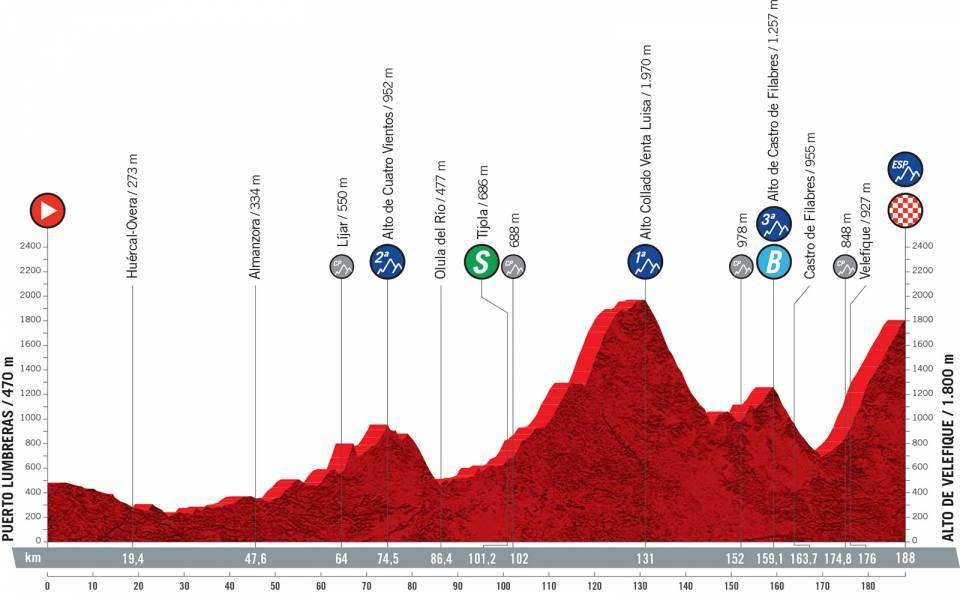 Dura jornada de alta montaña le espera al pelotón este día partiendo desde Puerto Lumbreras, en el recorrido se encontrarán con un puerto de 2da categoría, uno de 1ra, luego uno de 3ra y finalmente uno de categoría especial en el Alto de Velefique tras 188 km.