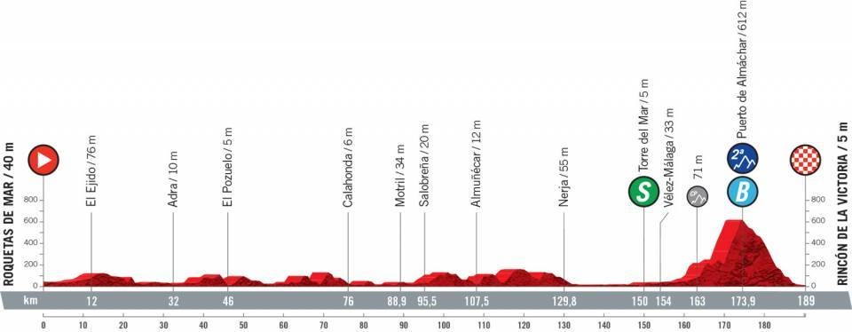 En Roquetas del Mar se iniciará la etapa 10 con un recorrido que tendrá algunas subidas cortas hasta llegar casi al final en donde se encuentran con la subida al Puerto de Almáchar para llegar en un largo descenso para arribar en el Rincón de la Victoria en los 189 km.