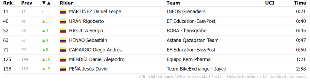 Los nuestros estuvieron bastantes pendientes de lo que sucedía en la competencia, no hubo un ataque por parte de los favoritos así que los candidatos de los colombianos, no tuvieron que salir a defenderse, llegando con el pelotón.